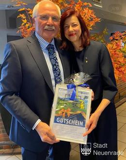 Oberbürgermeisterin Frau Sandner überreicht Antonius Wiesemann stellvertretend für die Stadt Neuenrade einen Gutschein für einen begehbaren Bilderrahmen.