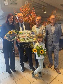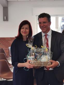 Oberbürgermeisterin Frau Sandner beglückwünscht Herrn Volker Klüter zur Wahl des neuen Bürgermeisters von Neuenrade und überreicht als Präsent Spezialitäten aus Klingenthal.