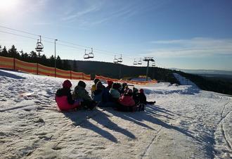 Einmal einen langen Rodelhang hinunterrutschen …. Das wünschten sich unsere Herbst- und Winterwichtel. So entschlossen wir uns am Freitag, den 16.01.2026 nach Schöneck zum Rodeln zu fahren. Unser Ausflug begann mit einer Fahrt mit der Vogtlandbahn nach Schöneck Ferienpark. Dort angekommen machten wir uns auf den Weg zum Rodelhang. Da dieser sehr vereist war, suchten wir uns in der Nähe des Sesselliftes eine andere Stelle zum Rodeln. Bei herrlichstem Sonnenschein konnten wir den ganzen Vormittag rodeln und hatten viel Spaß dabei. Zwischendurch legten wir bei warmen Tee und Obst eine kleine Pause ein. Nach 2 Stunden Rodeln waren wir ganz schön geschafft und fuhren mit der Vogtlandbahn wieder zurück nach Zwota. Es war ein herrlicher Tag im Schnee bei strahlendem Sonnenschein, der uns bestimmt noch lange in Erinnerung bleiben wird.