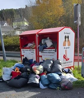 Bitte nutzen Sie bei vollen oder defekten Containern alternative Standorte oder geben Sie Ihre Altkleider direkt beim Wertstoffhof ab.
