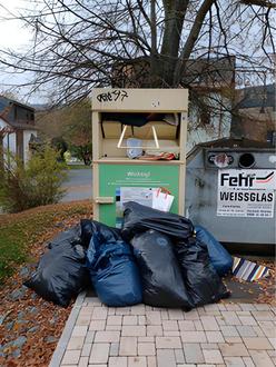 In den vergangenen Wochen wurden vermehrt illegale Ablagerungen von Abfällen, Kartons und Altkleidern vor Kleidercontainern festgestellt. Wir möchten alle Bürgerinnen und Bürger darauf aufmerksam machen, dass das Abstellen von Gegenständen oder Säcken neben den Containern eine Ordnungswidrigkeit darstellt. Verstöße werden gemäß § 28 Kreislaufwirtschaftsgesetz (KrWG) sowie § 12 der örtlichen Polizeiverordnung mit einem Bußgeld bis zu 1.000 € geahndet.