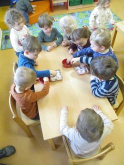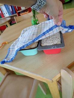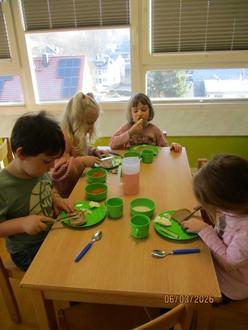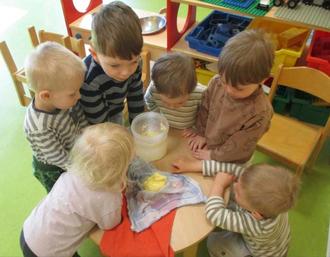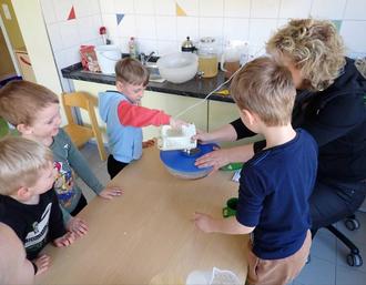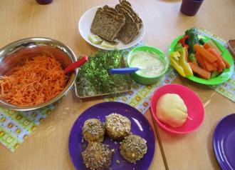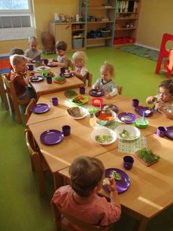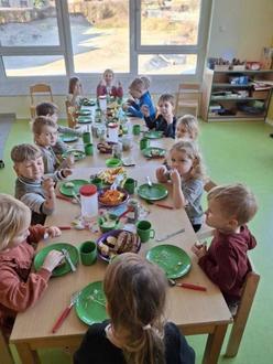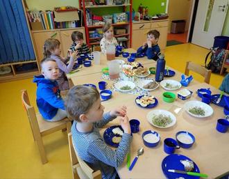 Es wurden von allen gemeinsam Vorbereitungen für ein gesundes Frühstück getroffen. Dafür wurde z.B. in den Gruppen Sprossen in Gläsern vorgezogen, Kresse für Salat und Frischkäseaufstrich angesät sowie Möhren und Äpfel zu einem leckeren Salat verarbeitet. Die Krippenkinder rührten einen leckeren Früchtequark an und die Jüngsten im Kindergarten zauberten aus Schlagsahne frische Butter. Und jede der älteren Kindergartengruppen haben selber Vollkornbrote sowie Haferflocken-Quark-Brötchen für das gesamte Haus gebacken. Auch ein paar gekochte Eier von glücklichen Hühnern und bunte Gemüsestreifen vervollständigten unser Frühstücksbuffet.
