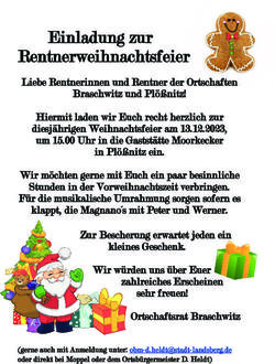 Hiermit lade ich Sie recht herzlich im Namen des Ortschaftsrates zum diesjährigen Seniorenfasching am 22.02.2023, um 15.00 Uhr in die Gaststätte Moorkecker in Plößnitz ein.
