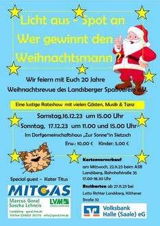 Die Vorstellungen sind wie immer im Dorfgemeinschaftshaus “Zur Sonne“ in Sietzsch und im Hof gibt es auch wieder einen leckeren Weihnachtsmarkt.