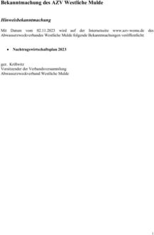 | Mit Datum vom 02.11.2023 wird auf der Internetseite www.azv-wemu.de des Abwasserzweckverbandes Westliche Mulde folgende Bekanntmachungen veröffentlicht: |