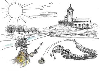 Vor sehr langer Zeit, im Mittelalter, lebte im Bergfried vom Schloss Hohenthurm der Bummelux, ein gutmütiger Berggeist. Dieser liebte die Tiere in der Mark Landsberg und half besonders Kreaturen, welche eine Malaise hatten. An einem schönen Dezembertag schwebte der Bummelux an der mäanderförmigen Saale entlang. Dort sah er auf einer Wiese eine alte Kreuzotter liegen, welche sehr stark nach Luft japste. Er fragte die Schlange, was ihr denn widerfahren sei. Die Kreuzotter antwortete: „Lieber Bummelux, ich fing eben in diesem Graben, der in die Saale mündet, einen prächtigen Barsch. Ich verspeiste ihn gierig, da ich sehr hungrig war. Dabei blieb mir wohl seine Mittelgräte im Halse stecken. Hilf mir schnell, Du großartiger Geist, sonst muss ich ersticken!“ Gesagt, getan – der Bummelux zog seinen Zauberstab aus seinem Wams und schwang ihn hin und her und orakelte dabei: „Lieber Gott lass unsre Schlange bald kräftig husten, damit entweicht des Barsches Gräte beim Prusten!“ Dann gab es einen Donnerschlag, die Kreuzotter musste stark husten und die Gräte flog im hohen Bogen heraus. Nun gab der Bummelux der Schlange noch einen Becher mit frischem Quellwasser, welchen die Otter gierig austrank. Gott sei Dank kam die Kreuzotter schnell wieder zu Kräften. Sie bedankte sich bei dem Berggeist und kroch schnell zu ihrem Nest. Dann eilte sie zurück und übergab dem Bummelux eine goldene Krone, die sie am Uferrand der Saale vor langer Zeit gefunden hatte. Der Geist probierte die Krone sogleich aus und strahlte wie ein König! Dann verabschiedeten sich beide Zeitgenossen und sagten sich Adschüss. Und wenn der Bummelux nicht gestorben ist, lebt er wohl noch heute in der Mark Landsberg!