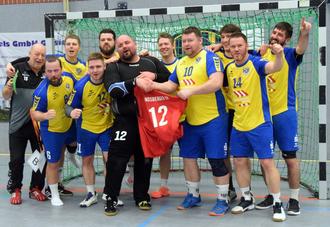 Jubel der Landsberger Männer nach dem 32:25-Sieg gegen den Quedlinburger SV.