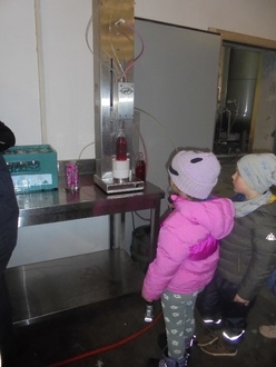 Zum Abschluss standen wir vor einer Einzelflaschenabfüllmaschine. Jedes Kind füllte nun eine eigene Flasche Himbeerbrause ab. Danach gingen wir an den Tisch zurück und klebten die Etiketten des „Süßen Krabbler“ auf unsere Flasche.
