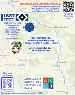 ... unter diesem Motto steht unsere dritte Auflage unserer Spendentour zu Gunsten des Ambulanten Kinder- und Jugendhospiz in Halle, die uns vom 16. bis 19. Mai 2024 von Landsberg (bei Halle/Saale) wieder nach Hamburg führen wird. In diesem Jahr unterstützen uns die Fanclubs 1887 Halle/Saale und Sektion 300 aus Eisleben.