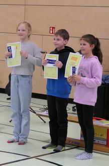 und mit ihren Lehrerinnen die besten Vorleser ausgewählt. Nach einem aufregenden Vormittag für diese Teilnehmer konnte die Jury folgende Platzierungen ermitteln: 1. Platz für Arne Kl.4a, 2. Platz für Sarah Kl.3a und 3. Platz für Valentina Kl.4b. Diese Leser erhielten neben ihrer Siegerurkunde einen Büchergutschein. Eine Urkunde und einen Buchpreis gingen an alle weiteren erfolgreichen Teilnehmer: Melanie und Lenny Kl.2a, Sophia und Lotta Kl.2b, Amalia und Mira Kl.2c, Lena Kl.3a, Conrad und Sebastian Kl.3b, Jenny Kl.4a und Sylvia Kl.4b. Wir danken allen Mitwirkenden, die zum Gelingen dieser Schultradition beigetragen haben und freuen uns schon auf die nächsten Buchvorstellungen im kommenden Jahr.
