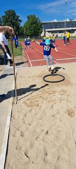 Die älteren Sportler der U10 sind schon routinierter. Torben, Anna-Sophie, Ilvie, Enie, Pius, Emma, Ben, Anna, Hanna, Jan und Lena sprinteten 40m, sprangen mit dem Stab, warfen auch den Ring und liefen einen Transportlauf. Im Ergebnis belegten sie einen guten 6. Platz. Vor allem beim Transportlauf konnten unsere Sportler punkten und holten die meisten Bänder.