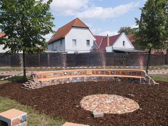 Ein kleines Amphitheater als Sagenkreis auf dem Dorfplatz Wendenring in Niemberg