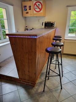 Des Weiteren wurde der Durchgang mit einem schwarzen Anstrich versehen, sodass eine optische räumliche Trennung stattfindet. Am Nachmittag kamen nun unsere neuen LED-Lampen an die Decke, egal ob im vorderen oder hinteren Bereich, an der Hauptwand oder über der Theke. Jetzt ist es im Jugendclub wieder hell erleuchtet. Am Sonntag hieß es jedoch so langsam fertig zu werden. Auf der neu angestrichenen Theke wurde die alte Arbeitsplatte entfernt und eine neue angebracht. Anschließend wurden unter der Theke neue Holzbretter verschraubt, sodass jetzt wieder mehr Platz für die Küchenutensilien ist.