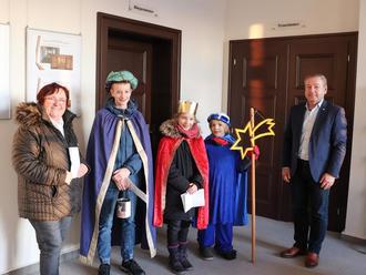 Michael Bedla begrüßte die Kinder, die als Caspar, Melchior und Balthasar gemeinsam mit Rosemarie Motz von der Katholischen Christ-König-Kirche Leuna ins Rathaus kamen, herzlich und spendete im Namen der Stadtverwaltung 50 Euro.