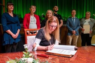 Die Vereinsmitglieder tragen sich in das „Goldene Buch“ der Stadt Leuna ein