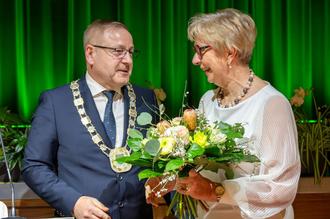 Michael Bedla überraschte Dr. Dietlind Hagenau mit Blumen und einem Dankeschön, das, was sie als langjährige Bürgermeisterin von Leuna (bis 2022) aufgebaut habe, sei eine gute Grundlage für die Weiterarbeit für ihn als Bürgermeister