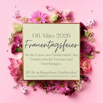 Im März lädt der Heimatverein traditionell die Frauen aus Günthersdorf, unseren Vereinen und Institutionen zur Frauentagsfeier am 8. März ein. Bitte melden Sie sich in der Bibliothek oder zu meinen Sprechzeiten dafür an!