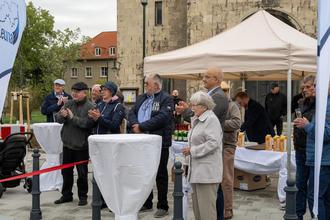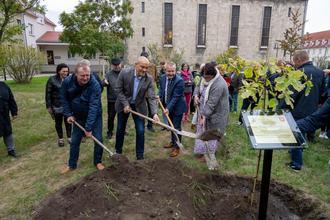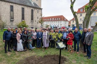 Die polnische Delegation mit Michael Bedla, dem Stadtratsvorsitzenden Daniel Krug und Stadtrat Peter Engel am neu gepflanzten Baum