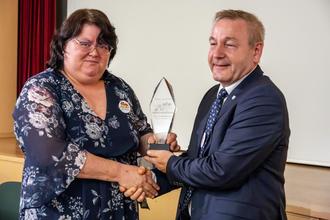 Olga Kaczmarek überreicht Michael Bedla einen Phighqal zur Erinnerung an das 20-jährige Jubiläum