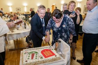 Olga Kaczmarek und Michael Bedla schneiden gemeinsam die „Partnerschaftstorte“ an