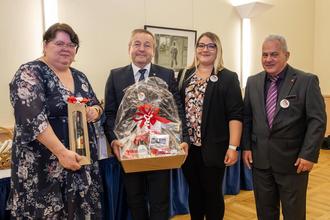 Olga Kaczmarek und Michael Bedla erhalten aus Wesseling Aufmerksamkeiten von Karolin Beloch und Stadtrat Thomas Giertz überreicht (v. l. n. r.)