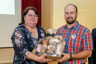 Pascal Martens überreicht Olga Kaczmarek ein Präsent mit regionalen Clauener Produkten