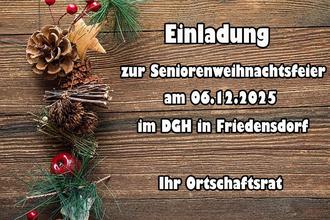 Am 06.12.2025 lädt der Ortschaftsrat alle Seniorinnen und Senioren ab 60 Jahren aus Friedensdorf zur Weihnachtsfeier ins Dorfgemeinschaftshaus ein.