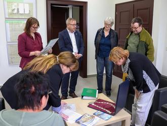 Stadtarchivar Ralf Schade führte zur Eröffnung der Ausstellung durch das Haus und gewährte den Gästen Einblicke in den Ratssaal, die Stadtkasse und unterhielt auch mit einer Anekdote zu Neurervorschlägen in der DDR im Bereich des Einwohnermeldeamtes. Besonders interessierte die Gäste die Amtskette des Bürgermeisters, die zur Ausstellungseröffnung zum Anfassen offen lag, während Ralf Schade über die Hintergründe der Anfertigung und die Entstehung informierte.