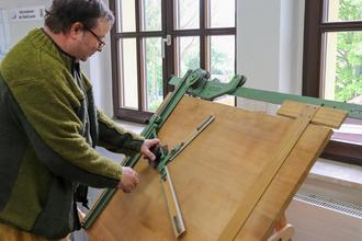 Stadtarchivar Ralf Schade am historischen Zeichenbrett