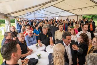 Der Bürgermeister mit den Gästen im Zelt während der Rede des Wirtschaftsministers