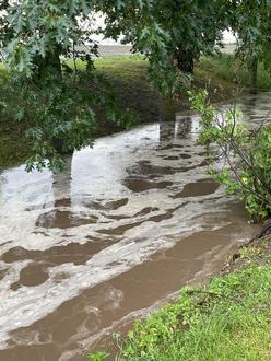 Vom frisch bearbeiteten und gedrillten Feld oberhalb des Floßgrabens bis zum Schrägweg, floss das Wasser verbunden mit loser Erde in den Flusslauf. Ältere Einwohner oder Einwohner die schon lange in Friedensdorf leben wissen wozu dies führen kann. So kam es dann auch. Im Kreuzungsbereich Siedlungsweg/Am Alten Floßgraben trat das Wasser über die natürliche Begrenzung des Floßgrabens und lief Richtung Dorfmitte zum Dorfteich. In voller Breite der Straße floss das Wasser Richtung Teich und verteilte sich auch auf die Grundstückseinfahrten der dort angrenzenden Anwohner.