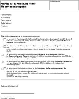 | 5. | Widerspruch gegen die Übermittlung von Daten an das Bundesamt für das Personalmanagement der Bundeswehr (§ 36 Abs. 2 Bundesmeldegesetz). |