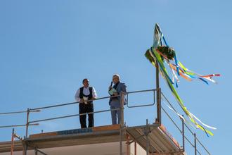 Gemeinsam mit Zimmerermeister Uwe Undeutsch begrüßte Michael Bedla die Gäste des Richtfestes vom Dach aus, während die bunten Bänder des Richtkranzes im Wind flatterten. Der Richtspruch wurde vom Zimmerermeister vorgetragen, im Anschluss daran zerschlugen Bauherr und Zimmermann die Sektgläser - Scherben bringen schließlich Glück.