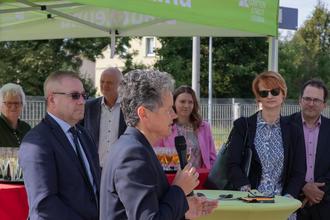 Dr. Lydia Hüskens, Ministerin für Infrastruktur und Digitales, übergibt gemeinsam mit Bürgermeister Michael Bedla die neue Straße am Bahnhof Kötzschau