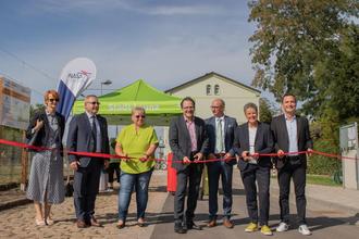Feierliche Übergabe: Annett Hellwig (stellv. Landrätin des Landkreises Saalekreis), Michael Bedla (Bürgermeister Stadt Leuna), Doreen Blumtritt (Ortsbürgermeisterin Kötzschau), Peter Panitz (GF NASA), Florian Schröder (MdL/AfD), Dr. Lydia Hüskens (Ministerin) und Sven Czekalla (MdL/CDU) durchschneiden das rote Band