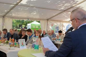 Michael Bedla und die Gäste des Ratsfrühstückes, geladen war der Stadtrat, Ortsbürgermeister und der Landrat, der von Dezernentin Christina Kleinert vertreten wurde