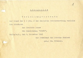 Ein Original der Verleihungsurkunde gibt es auch im Landeshauptarchiv Magdeburg nicht mehr. Zu diesem Verwaltungsakt gibt es nur die Abschrift im Stadtarchiv Leuna.