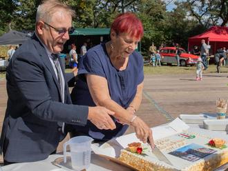 Bürgermeister Michael Bedla bat beim Anschnitt der Festtorte um Unterstützung aus dem Publikum, Christel Timmel aus Leuna übernahm gern diese Aufgabe