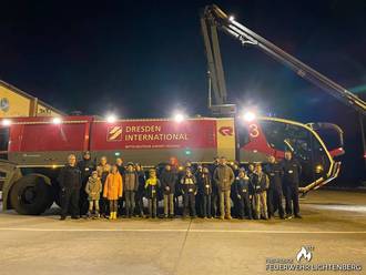 Gemeinsam trafen wir uns am Nachmittag am Gerätehaus unserer Feuerwehr und fuhren dann zum Flughafen nach Dresden. Dort angekommen wurden wir bereits in Empfang genommen und begaben uns in Richtung des „Sicherheitscheck“. Nach kurzer Kontrolle wurden wir mit einen Bus über den Flughafen, in Richtung der Wache der Flughafenfeuerwehr gebracht. 2 Stunden lang wurde den Kindern von den Räumlichkeiten, über Bilder früherer Einsätze bis hin zur riesigen Technik alles gezeigt.