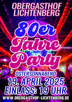 Anders als sonst startet die Party diesmal Punkt 20:00 Uhr so wie früher! DJ Silko, wird dich mit den besten Hits der 80er zum Tanzen bringen. Die Musikreise führt dich durch die unterschiedlichsten Musikrichtungen dieser aufregenden Dekade – von Italo Hits, NDW, Depeche Mode und DDR Rockmusik bis hin zu den beliebtesten Pop- und Schlager Hits und vieles mehr der 80er. Zudem werden wir einige besondere Videoclips aus dieser Zeit zeigen, die die Klassiker in Bild und Ton wieder aufleben lässt. Die beiden DJ`s Stephan + Lutz die schon in den 80ern als „Staatlich geprüfte Schallplattenunterhalter“ unterwegs waren, werden diesen Abend abrunden. An unserer Bar werden wir auch einige Drinks die es damals in Lichtenberg gab anbieten. Vielleicht erinnert sich noch jemand an „Vulkano“ „Prärie Auster“ oder „Grüne Wiese“ die damals gern und oft im Obergasthof getrunken wurden.