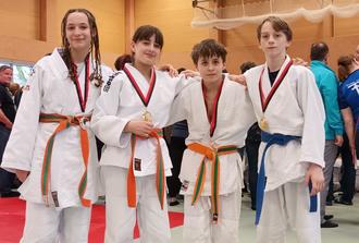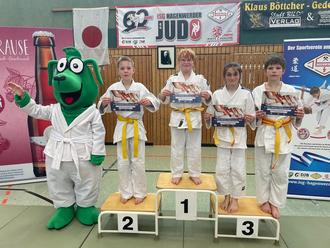 Einen kompletten Medaillensatz brachten unsere Jüngsten aus Ostritz mit nach Haues. Florian Friedrich, Charlotte Huste, Lea Mütze und Linus Schütze (v.l.n.r.) zusammen mit dem Matten-August, dem Maskottchen des sächsischen Judoverbandes.