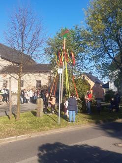 Unser Maikranz wurde wenige Tage zuvor von den fleißigen und geschickten Frauen des Dorfes frisch gebunden. Mit eifrigen Kindergarten- und Grundschulkindern wurde der traditionelle Bändertanz neu eingeübt.