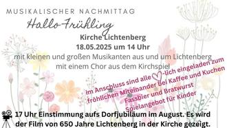 Anlässlich unserer 675 Jahr-Feier werden wir dann frisch gestärkt, als Abschluss um 17 Uhr, in unserer Kirche den Amateurfilm zu 650 Jahre Lichtenberg sehen! Da werden sicherlich viele Erinnerungen wach.