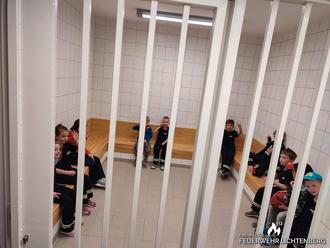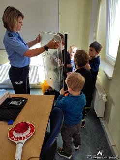Pünktlich 17 Uhr wurden wir von 2 Polizisten in Empfang genommen. Zu Beginn ging es in den Schulungsraum, in welchem die Kinder aber auch die Erwachsenen viele interessante Dinge über die Aufgaben, Ausrüstung und Einsätze der Polizei erfuhren. Dabei durften wir die Ausrüstung auch mal ausprobieren. So hatten die Kinder einmal Handschellen um, durften das Schutzschild halten oder auch eine Sicherheitsweste tragen. Danach ging es zur Besichtigung der Arrestzellen, in die wir uns „einschließen" lassen konnten. Zum Abschluss ging es noch zu den Fahrzeugen. Diese wurden intensiv begutachtet, es wurde Probegesessen und das Blaulicht getestet.