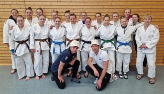 Die Frauenmannschaft vom Lichtenberger Judoteam mit ihren Trainern Julian Mann (i) und André Husseck beim ersten Kampftag in Leipzig.