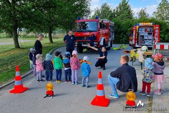 Anlässlich einer Projektwoche „Der Welt-Rotkreuz-Tag" in der "Kita Entdeckerland Lichtenberg" konnten die Kinder mehr über verschiedene Hilfsorganisation erfahren. Neben der Polizei und dem Rettungsdienst stellten auch wir uns als Feuerwehr den Kindern vor. Dabei wurden unsere Aufgaben den über 70 Kindern spielerisch nähergebracht. Von der Einsatzstellenabsicherung, dem Feuerlöschen über das Retten von Personen bis hin zum Dienstsport konnten sie so einiges über unsere Arbeit erfahren. Uns war dabei wichtig, den Kindern nahezubringen, dass alle diese Aufgaben nur in Teamarbeit zum Erfolg führen. Die von den Kindern selbst gebackenen Kekse als Dankeschön fanden wir sehr lecker.