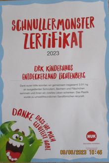 Bis Ende März hat in unserem Kinderhaus das Schnullermonster gewohnt, gleich neben der Eingangstür. Dort konnten Eltern und Kinder ihre ausgedienten Schnuller und Trinkflaschen abgeben, damit sie zu neuen Sandförmchen recycelt werden können.