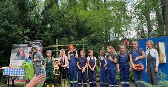 Dank der Freiwilligen Feuerwehr Lichtenberg trugen unsere Schauspieler sogar die passende Kostümierung. Und ein echtes Feuerwehrauto konnten uns die Kameraden außerdem zur Verfügung stellen. Da war es dann auch selbstverständlich, dass Löschmeister Wasserhose, Wachtmeister Meier und die anderen Jungs das Feuer bei Oma Eierschecke mit der Pumpspritze löschen konnten. Zum Glück wurde auch Emil Zahnlücke aus dem Lauterbach gerettet und der umgestürzte Baum im Tierpark konnte ebenfalls weggeschafft werden.