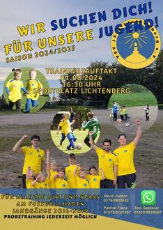 Die neue Spielsaison steht vor der Tür, und die Vorfreude auf die kommende Spielzeit ist groß, denn der TSV Lichtenberg wird in einer Spielgemeinschaft mit dem SV Lomnitz eine F-Jugend-Mannschaft stellen und am Ligabetrieb teilnehmen. Weiterhin wollen wir Turniere mit den Bambinis besuchen. Um dies auch sportlich mit Erfolg zu gestalten, starten wir am 01.08.24 mit dem Trainingsauftakt ab 16:30 Uhr auf dem Sportplatz in Lichtenberg. Wir freuen uns über jeden weiteren Neuzugang, den wir mit Spiel, Spaß und Freude am Fußball hier in Lichtenberg begeistern können. Wir sehen uns!