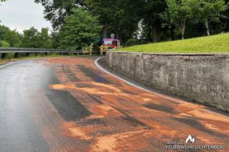 Die Einsatzstelle wurde zunächst abgesichert. In den besonders betroffenen Gefahrenbereichen stumpften wir die Fahrbahn mit Bindemittel ab, um die Gefahr für Verkehrsteilnehmer zu minimieren und ein Eindringen der Betriebsmittel in die Kanalisation bzw. in angrenzende Gewässer zu verhindern. Ein Spezialunternehmen zur fachgerechten Beseitigung der Ölspur wurde verständigt und angefordert.